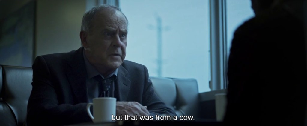 Lacey kills people and eats them, particularly their fingers (which are very portable) and their long bones. She needs the bone marrow, she tells the cop, Godfrey (Peter MacNeill, whom you might have seen as Barry Goldwater in Mrs America). He replies that he eats marrow on toast,