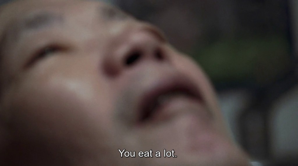 The first thirty minutes are a gruelling close-up of the two men – Issei and Jun and their desultory interactions, with the camera so close you can see every pore, except when it (blessedly) goes out of focus. Issei is largely catatonic, staring sightlessly as we, in turn, stare in extreme close-up at his face, which looks almost like a death mask. The only signs of animation are when he is offered chocolate, of which he seems inordinately fond, perhaps as a substitute for the human flesh he so craved. Probably not great for his diabetes, but we’re not really hoping for a happy ending to this story.