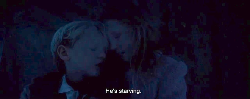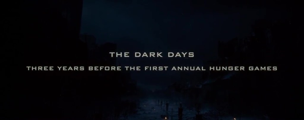 But this is a movie, and you know the golden rule: show don’t tell. So the opening reveals two children, a young Coriolanus and his cousin Tigris, running through the snowy streets of the Capitol during the rebellion, hunting for food. A man appears with a cleaver and chops the arm from the corpse of a woman.