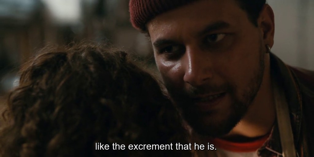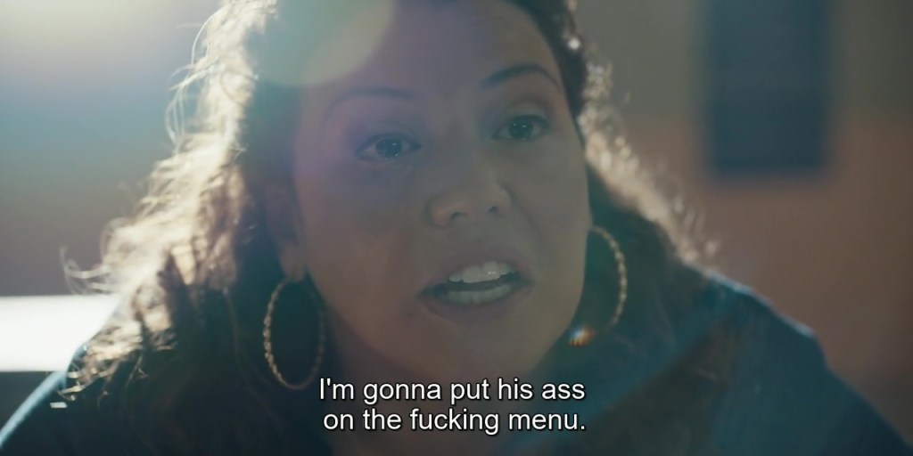 She forces the showrunner to take her to a house where, he says, someone knows the whereabouts of the man who betrayed her and left her to rot in jail. When the door opens, she roars with laughter, and then pounces, but at whom? All we know is that, like Georgina in The Cook, The Thief, she is directing her invective at us, the audience! We may not know where her ex is living. But we do know that cannibalism starts at home.