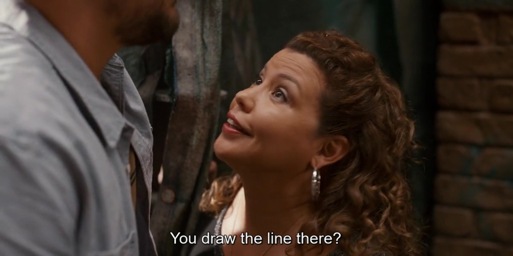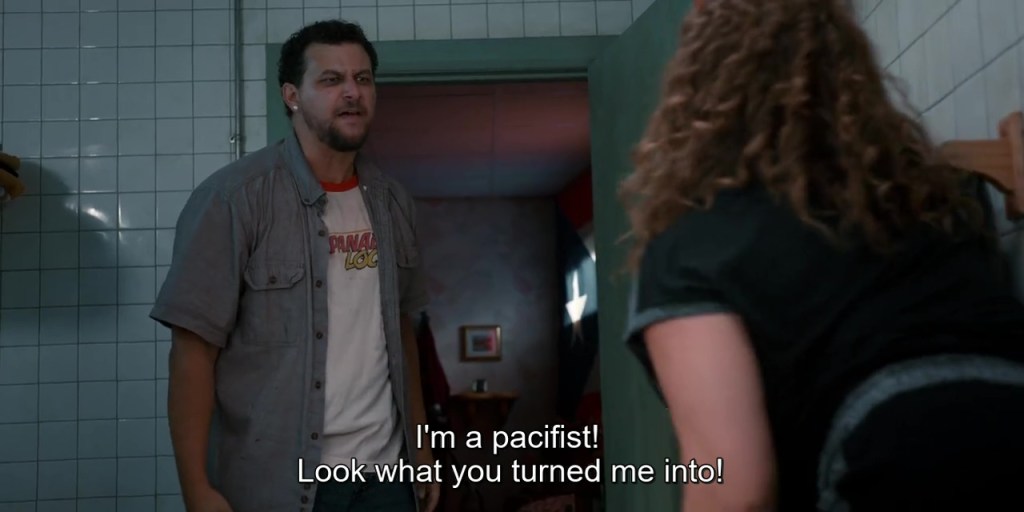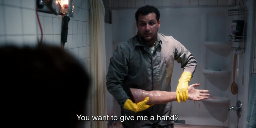 She’s much more upset about the cannibalism than the increasing number of corpses she is leaving all over the shop. Odd that. Luis sees meat as his business, and Dolores’ steady body count as his (very reasonably priced) supplier. He’s not too fussed about all the killing, as long as he doesn’t have to do it – like customers in a butcher shop. When he finally kills a man, he is upset: “Look what you made me do!”