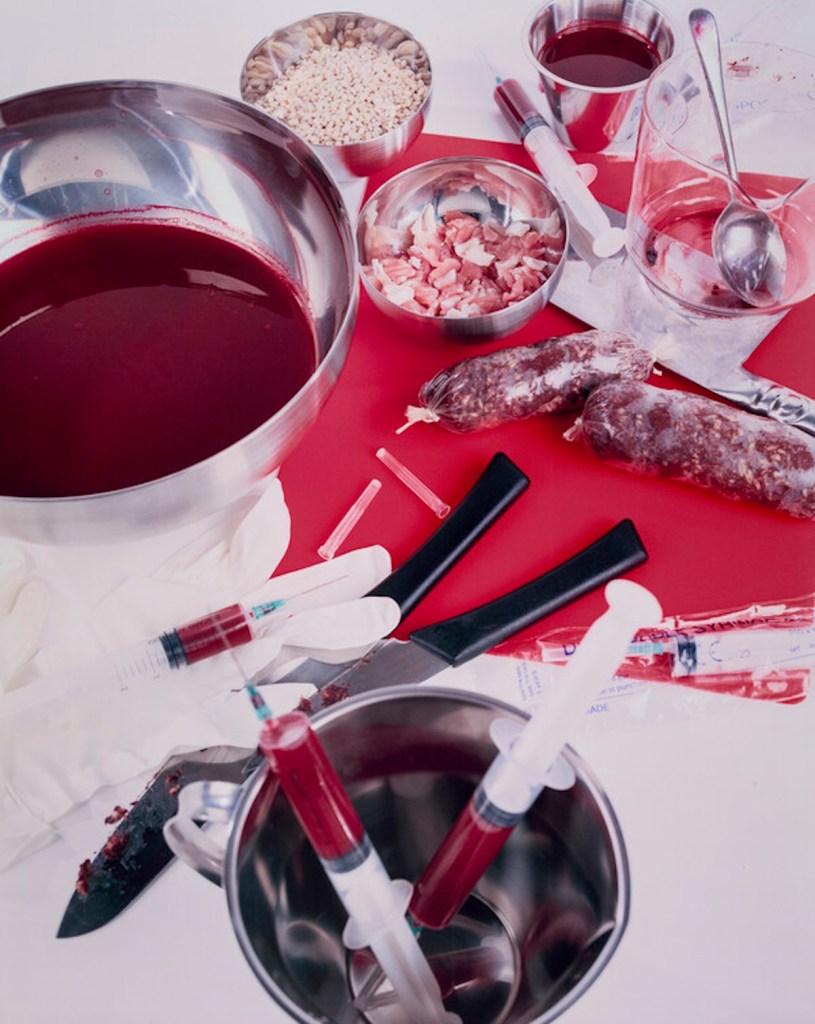 The pair have been collaborating since 1996 and making their “cannibal” sausages since 2004. They call their performance and exhibition a “black pudding self-portrait” or Sanguis Gratia Artis.