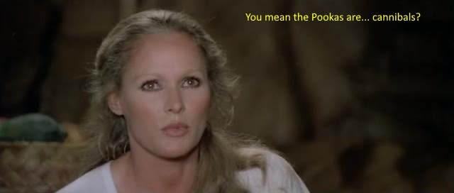 The first half of the film is about a motley bunch of white people heading for Papua New Guinea (it was actually filmed in Sri Lanka) on a Pakistani plane, to explore a heavily wooded island inhabited by cannibals called the Pookas, and the various reasons they are there (uranium, that sort of thing, yawn).