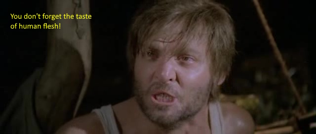 Cannibalism doesn’t get a look in until after the first half, when Foster admits to having lived with the Pooka tribe, where he had to eat human flesh. It haunts him still, and he wants to exterminate them. Sure, eating dead humans is horrifying, but killing live ones is fine.