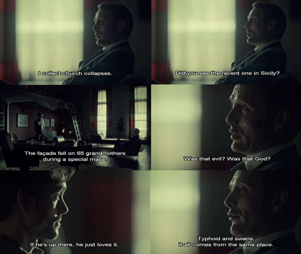 Now Hannibal often quotes God, which bothers many in the audience, including, at this point, Will. What God does Hannibal pray to? Well, he doesn’t pray, we are not awfully surprised to learn. He’s just impressed by disasters, particularly church collapses.