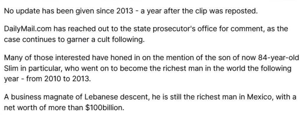 Carlos Slim at that time was apparently the richest man in Mexico or maybe the world, controlling América Móvil, Latin America’s biggest mobile telecom firm, so it’s not too surprising that her rant was shut down pretty quick, and she was carted off, presumably to a mental asylum, wherein she perhaps still rots, unless she has been cured, killed, or eaten.