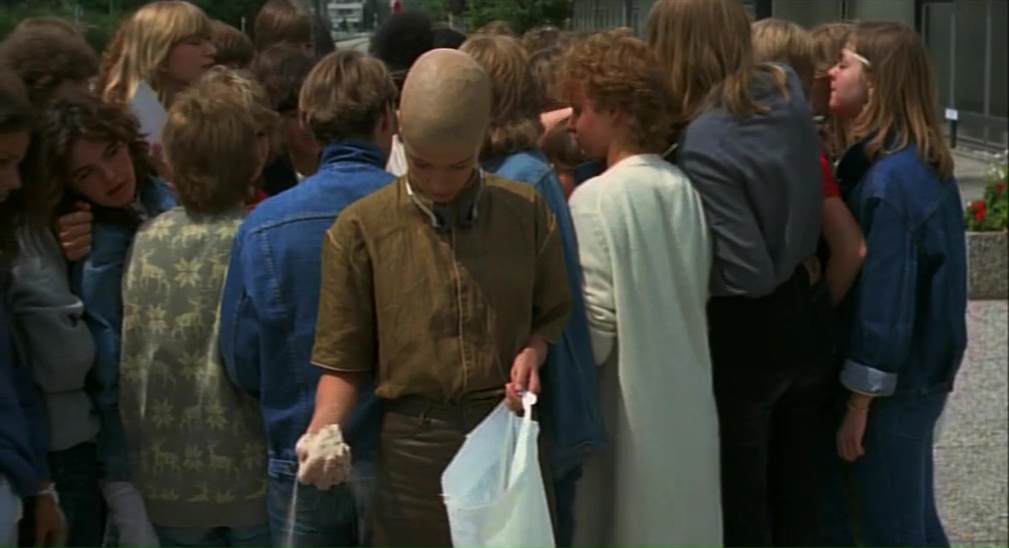 Simone (a bravura performance by 17-year-old Désirée Nosbusch) is a teenage fan obsessed with a pop singer known only as “R.” That obsession takes over her life – she drops out of school, waits outside the post office for a week for a reply to her letter, which will never come because his fan mail goes straight to the tip. She climbs to the top of the church steeple in her town of Ulm (it’s actually the tallest steeple in the world) and thinks about jumping off, splattering herself all over the town square, but with a letter to R in her pocket, so he will hear of her at last.